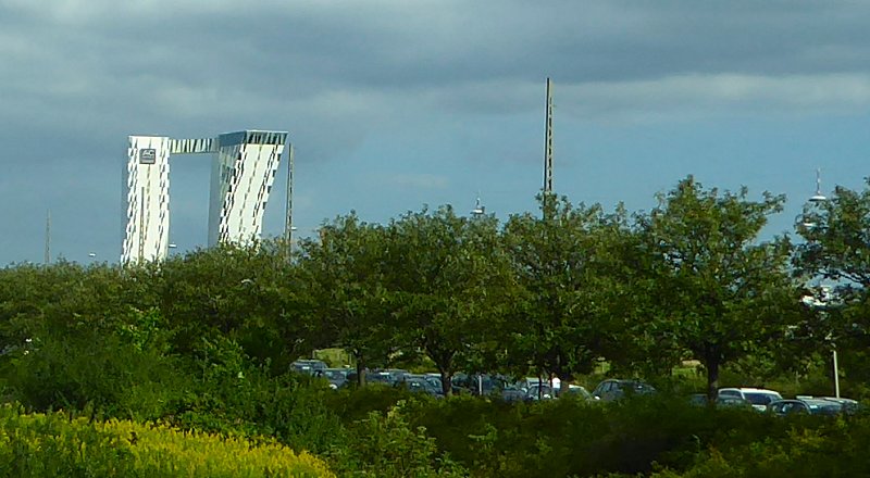 We komen langs de Incineration Line 6, een recent door de Nederlandse architect Erick van Egeraat afgeronde afvalverwerkingscentrale van het Deense bedrijf Kara/Noveren. Het is een prachtig stukje architectuur. Uitgerust met lasergesneden cirkels die de hele gevel versieren, licht het gebouw in de nacht op via 1.000-den individueel gecontroleerde LED-lichten die de kastanjebruine centrale van binnenuit verlichten, als symbool voor de verbranding die binnen gaande is. Lager bij de grond is het gebouw gemodelleerd naar de hoekige fabrieksdaken in de buurt. Het gebouw zelf culmineert in een 100 m hoge toren die verwijst naar het historische landmark van de Roskilde Kathedraal, met zijn herkenbare torens en warme steenkleuren.