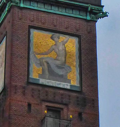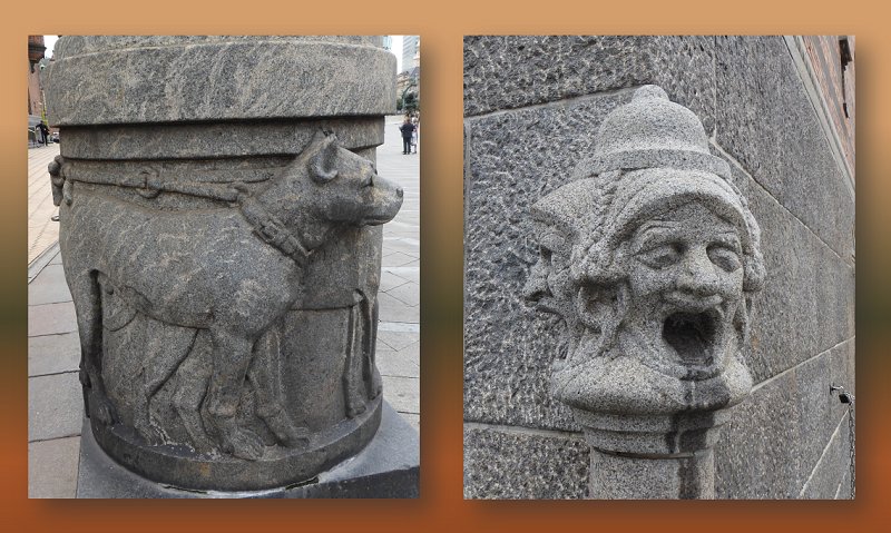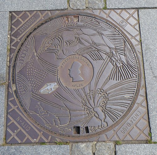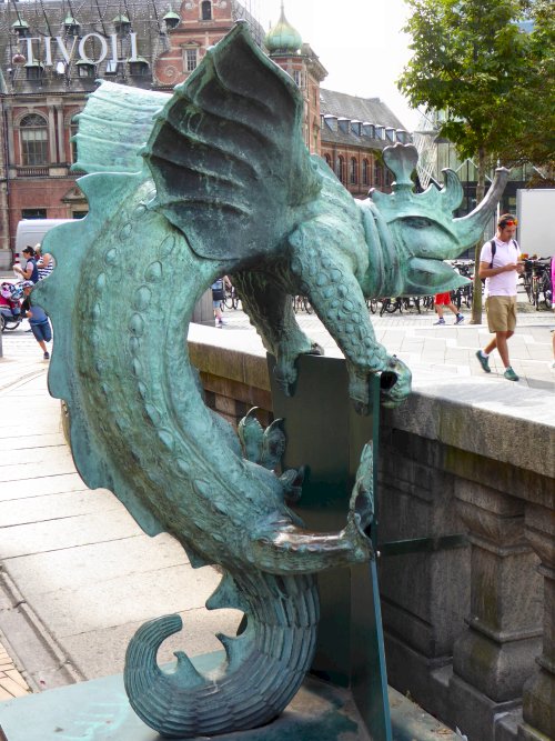 Als we weer buiten zijn kijken nogmaals naar het gouden standbeeld van Absalon, de stichter van Kopenhagen en lopen nog even naar een drakenbeeld. Ook een putdeksel krijgt -als steeds- onze aandacht.