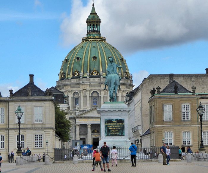 Dennis parkeert de bus vlak bij het oude Tolhuis. Vandaar lopen we -met zicht op de Dom- naar het slot Amalienborg.