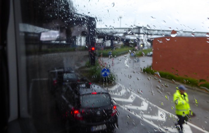 We zijn op tijd aanwezig, maar de ferry heeft vertraging. Het is inmiddels flink gaan regenen.