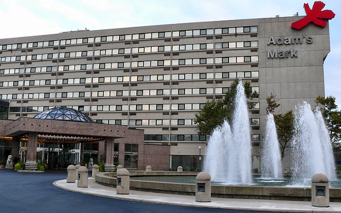 We komen bij Adam’s Mark Hotel in Buffalo aan om 17:30 uur. Wie wil er nog bomen zien? Het gaat regenen. Onze kamer is groot, de badkamer daarentegen vrij klein. Ook in dit hotel zijn de wastafel en het toilet erg laag geplaatst. Dat zal dus wel standaard zijn.