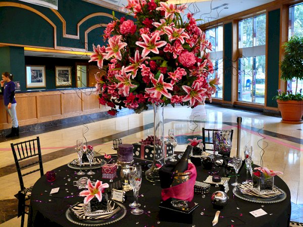 In het midden van de hal van het hotel staat een tafel smaakvol gedekt. Om eetlustigen op afstand te houden is hij met een rood koord afgezet.