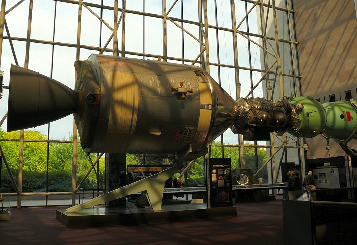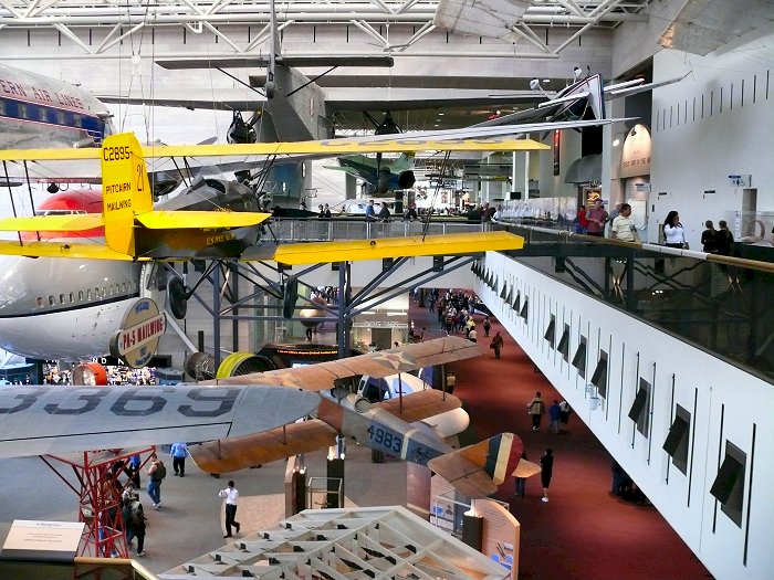 We gaan eerst naar het National Air and Space Museum. Het heeft de grootste collectie van vlieg- en ruimtevaartuigen in de wereld. Van alle musea in de stad -of misschien zelfs in heel Amerika- trekt dit museum verreweg de meeste bezoekers.