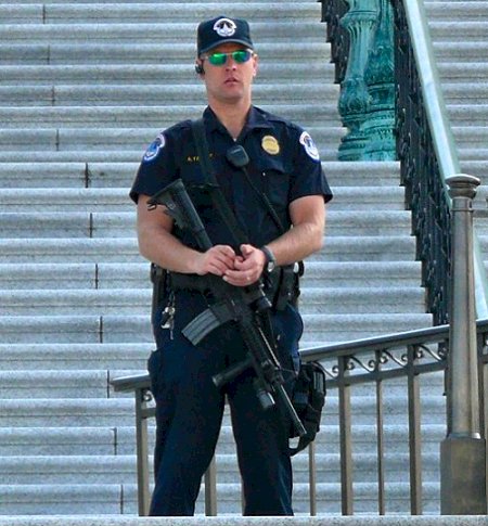 het Capitool op. Hekken verhinderen dat we verder gaan. Overal, tot op het dak,