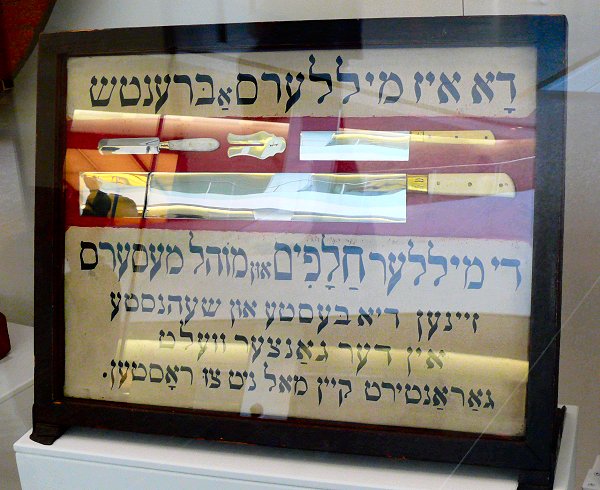 De Miller winkel op 25 Canal Street in New York City maakte met uiterste precisie met de hand messen voor het ritueel slachten en ook klemmen en mesjes voor het ritueel besnijden. Het op het uithangbord afgebeelde grote rechthoekige mes is voor het slachten van vee, het kleine rechthoekige mes voor het slachten van pluimvee. De 2 andere afbeeldingen stellen een klem en een tweezijdig snijdend mes voor het besnijden voor. In de joodse traditie werd en wordt nog steeds trouwens veel nadruk gelegd op netheid, snelheid, efficiëntie en minimalisering van pijn bij het gebruik van deze attributen.