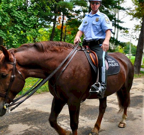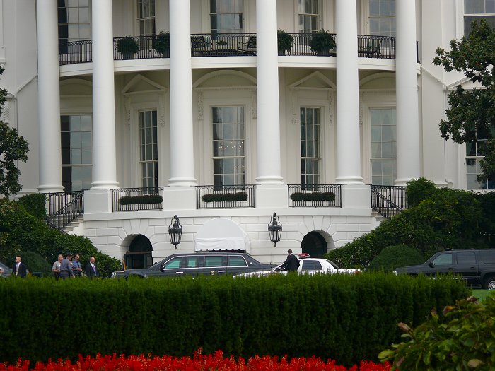 Dan gaan we naar het Witte Huis. We mogen niet aan de voorkant komen. Dus blijven we aan de achterkant. En heel ver weg. Ook hier zien we overal veiligheidsagenten. Op afstand lijken het wel antipersoneel snipergeweren waarmee ze gewapend zijn. De presidentiële limousine staat rijklaar. Op de linkerflank prijkt de vlag met het presidentiële zegel, op de rechterflank die van de Verenigde Staten. Niet zichtbaar met het blote oog. Maar wél door een zoomlens. Zoals de vorige presidentiële limousines, kreeg ook deze de bijnaam The Beast, omwille van haar indrukwekkende uitrusting.