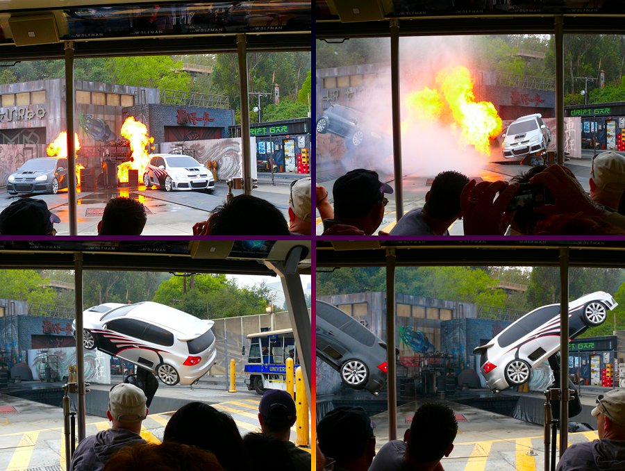 In het graf van Imhotep -uit de film The Mummy- voel je beestjes in zwermen over je voeten lopen. Buiten zien we een brug waar we dan net overheen zijn door een bom getroffen worden en instorten en auto's waar we vlak langs rijden als gevolg van een ontploffing door de lucht vliegen. We rijden langs sets waar bekende films, als Jaws, en tv-series, als Desperate Housewifes, zijn opgenomen. We komen zelfs door de straat waarin het vliegtuig is neergestort in de film War of the Worlds. Bij de set waar de film Psycho van Alfred Hitchcock is opgenomen, zien we nog net dat een vent een lijk in de kofferbak van z'n auto legt. Hij ziet ons ook trouwens, reden om op ons af te stappen met een vervaarlijk lang mes in z'n hand.
