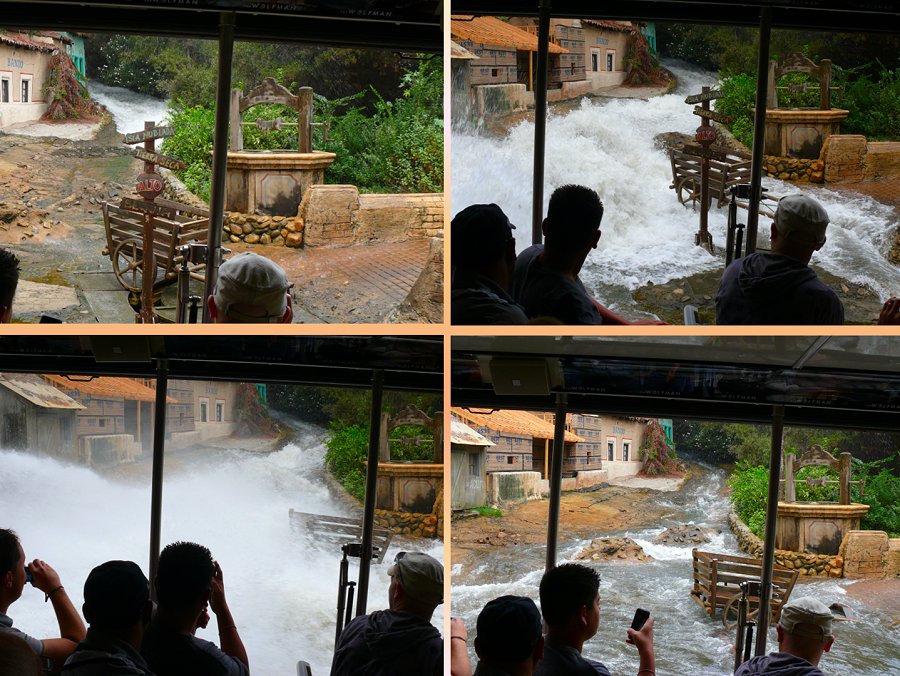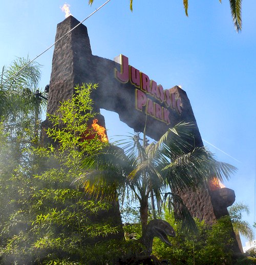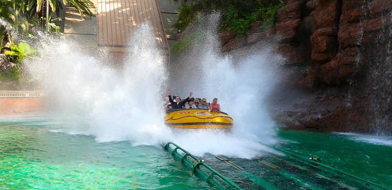 We kijken eerst bij de Jurrasic Park attractie, een waterbaan. Je komt bijna 25 m stijl naar beneden, waar je boottochtje eindigt in een splash. We zien een aantal reisgenoten. Helaas -meer voor hen dan voor ons trouwens- heeft Els de camera niet in de aanslag.