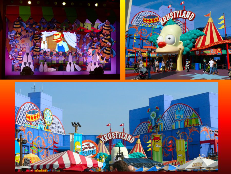 Dan gaan we naar The Simpsons Ride, een simulatorattractie, gebaseerd op The Simpsons, een Amerikaanse animatiefilm. De rit duurt zes minuten, maar wordt voorafgegaan door een voorshow. De attractie speelt zich af in een pretpark genaamd Krustyland. 24 bekende personages uit de serie komen in de attractie voor, waaronder de familie Simpson, Krusty en Sideshow Bob. In de voorshow is te zien hoe Sideshow Bob ervoor zorgt dat Krusty de Simpsons uitkiest om de nieuwste attractie in zijn park, een achtbaan, uit te testen. De attractie zelf is een bewegingssimulator die de indruk wekt dat de mensen in de attractie in de achtbaan zitten, in het karretje achter de Simpsons. Terwijl het karretje over de achtbaan raast, probeert Sideshow Bob de kar te raken met een sloopkogel, een zware stalen bal die wordt gebruikt in de sloopsector. Vervolgens splitst het karretje zich op en komen de personages in verschillende omgevingen terecht, waaronder het huis van de Simpsons zelf.