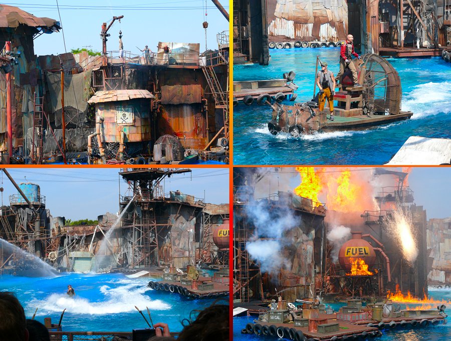 De stuntshow is gebaseerd op de film Waterworld uit 1995. De show werd in het attractiepark opgenomen toen de film uitkwam. Hoewel de film een flop werd, is deze stuntshow een groot succes. De zittribune bestaat uit 3 delen, die omhoog en naar achter gaan. De voorste stoelen zijn de zogenaamde 'wet seats' oftewel de plaatsen waar je gegarandeerd nat wordt. Wat is het verhaal van de film en dus ook van de show? De planeet, die ooit Aarde werd genoemd, is bijna helemaal overstroomd. De ijskappen zijn gesmolten en het water stijgt nog steeds. Het zal niet lang meer duren of ook de laatste droge schuilplaatsen zullen verzwolgen worden door de meedogenloze zondvloed. Is er ergens land te vinden of is de hulpeloze, losgeslagen mensheid gedoemd te sterven in deze onbarmhartige waterwereld? Woeste piratenbendes varen plunderend en brandstichtend rond. Goedwillenden zijn op zoek naar een lang vergeten, mysterieuze plaats. Natuurlijk komen ze elkaar tegen....