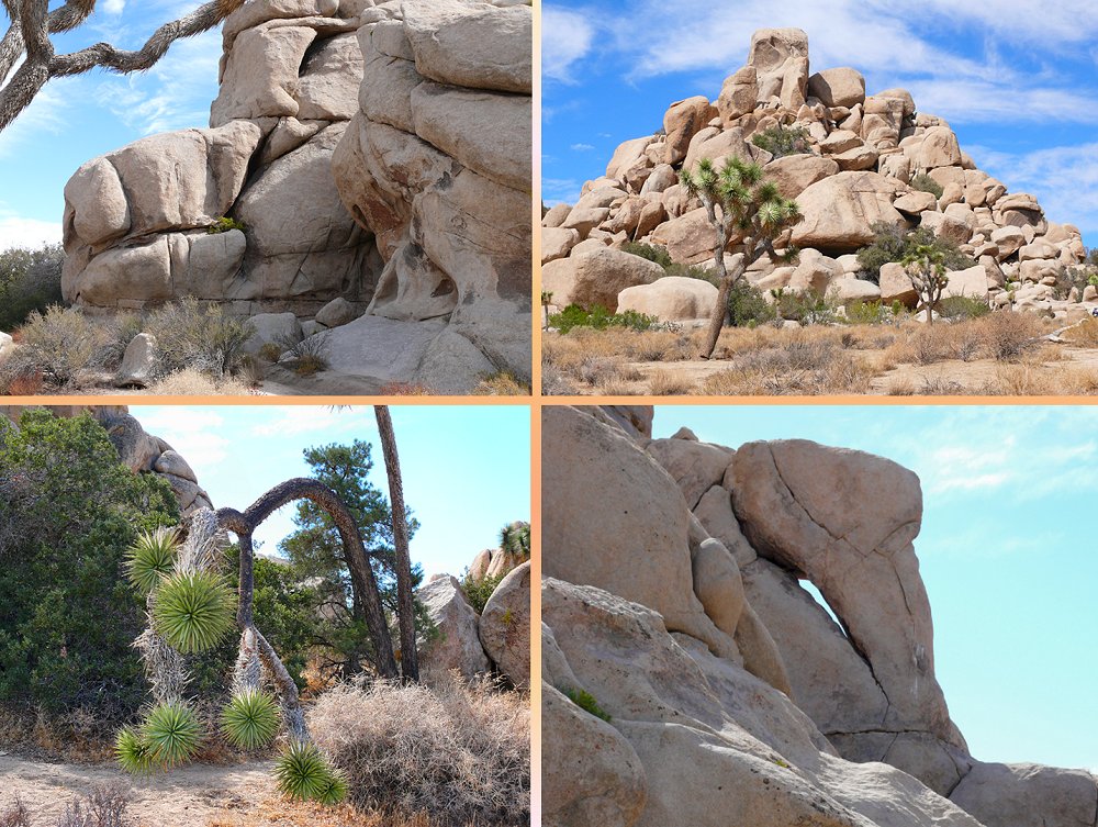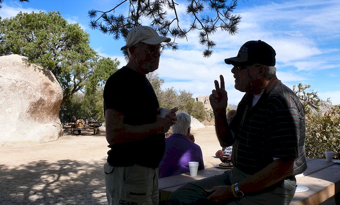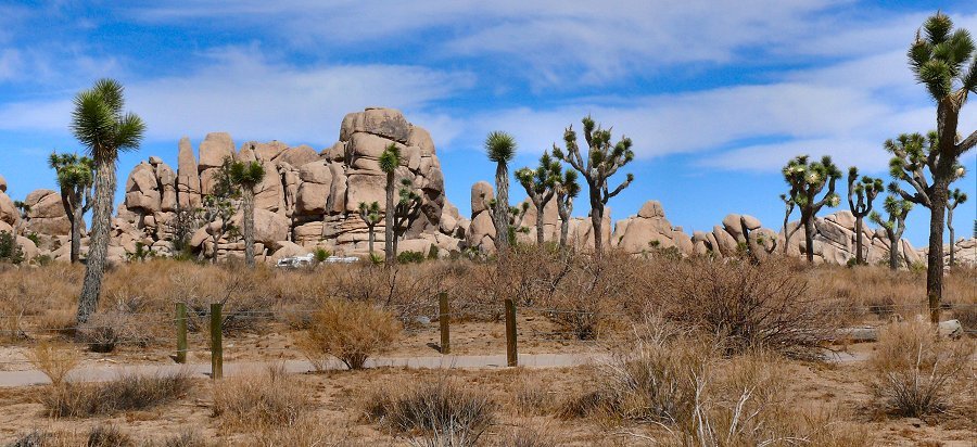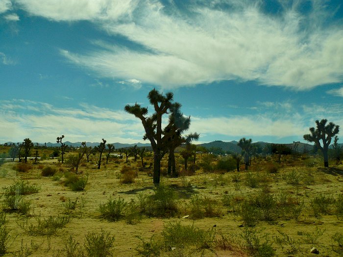 Via de Interstate 62 rijden we naar Joshua Tree National Park. Maar niet rechtstreeks. We stoppen ergens bij een shopping center tussen Joshua Valley en Yucca. Het is dan 11.45 uur. Bij supermarkt Vons kopen we brood, beleg, wijn en frisdrank voor de picknick. We zitten inmiddels in de Morongo Valley. Er staan erg veel joshua trees. Dat zijn, anders dan de naam doet vermoeden, geen bomen maar grote planten, die behoren tot de familie van de Yucca's. De grillig gevormde joshua tree is een van de meest karakteristieke planten in de Mojave Desert. De grootste exemplaren zijn ongeveer 12 m hoog, en zijn naar schatting zo'n 900 jaar oud.