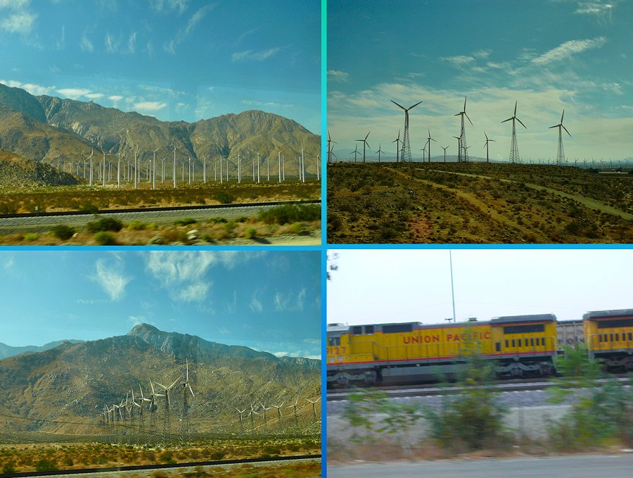 Ook rijden we een behoorlijk lang stuk langs een spoorlijn. Het goederentreinvervoer vindt in Californië plaats over 2 spoorlijnen: één van noord naar zuid en één van oost naar west. Ze kruisen elkaar bij Barstow. Er wordt van diesellocomotieven gebruik gemaakt. Bij de spoorlijnen ontbreekt derhalve een bovenleiding. Dubbeldekscontainers zijn daarvan het gevolg.