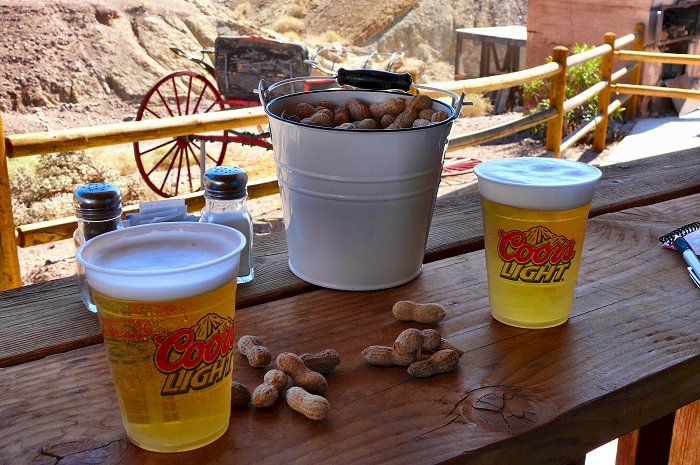 Hoewel het nog vroeg is, gaan we eerst op zoek naar de saloon. Die is gauw gevonden. We kiezen voor Coors light beer. Bij barhangen horen pelpinda's. Maar hier zijn het wel zoute. Dat stimuleert het bier drinken natuurlijk enorm. De pindadoppen gooi je maar gewoon op de grond. Dat doet iedereen.