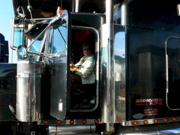Hans krijgt het voor elkaar dat Els in zo'n pracht exemplaar -een Peterbilt truck- achter het stuur mag zitten.
