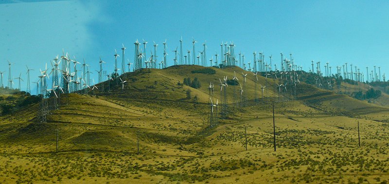 Even voorbij Mojave ligt een van de grootste windmolenparken ter wereld. Wij kunnen er vanuit de bus een glimp van opvangen.