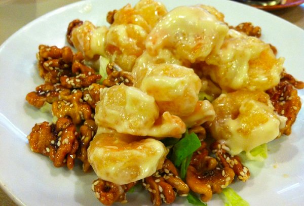 We eten in het Chinees restaurant Charlie Chan Café van het hotel. We nemen alletwee honey walnut prawns met een Samuel Adams boston lager en een Widmer Hefeweizen.