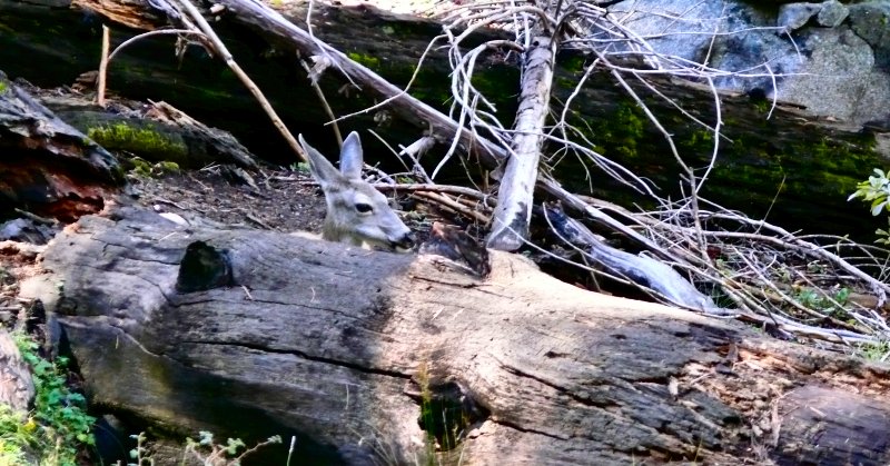 We wandelen 3 kwartier heen en nog eens 3 kwartier terug. We zien mule deers en horen spechten. Een mule deer lijkt op een hert, maar heeft wat grotere oren en z'n staartje is niet helemaal wit maar heeft een donker uiteinde.