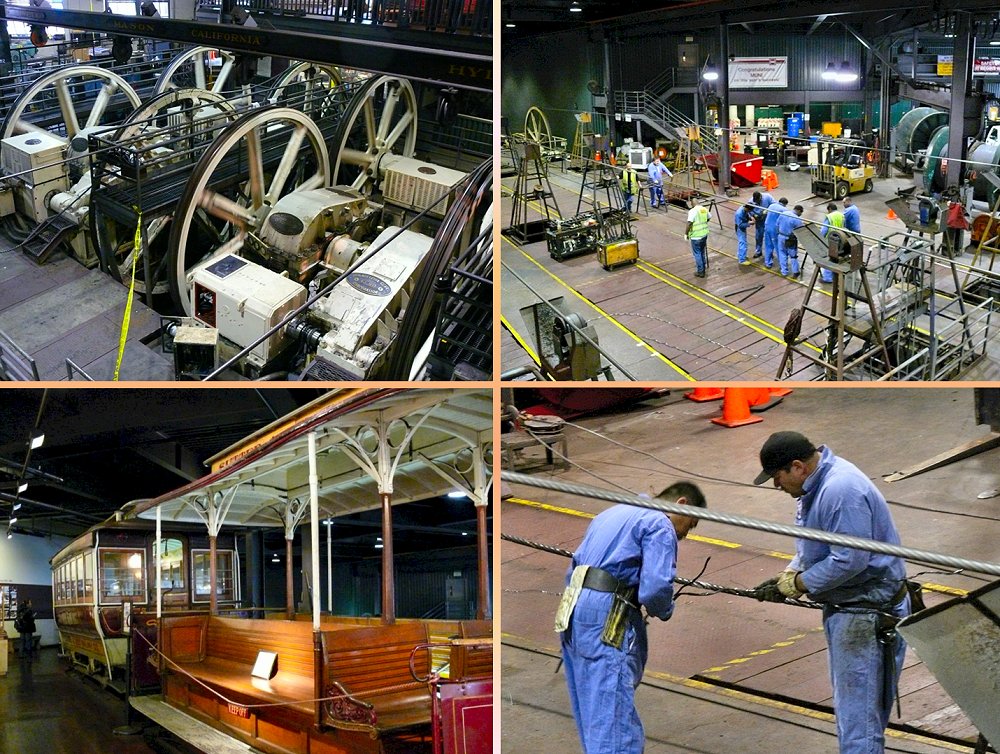 In 1873 reden voor het eerst de unieke Cable Cars in San Francisco. Het museum is het zenuwcentrum van deze beroemde trams. Je kan in een ondergrondse kijkruimte annex werkplaats zien hoe de Cable Cars werken. Wij hebben het geluk meer te zien: het repareren van de kapotte kabel waarvan wij zojuist last hebben gehad. Maar liefst 6 mannen zijn daar druk mee. Staalkabels werden in het verleden gecontroleerd door met een dot poetskatoen langs de kabel te lopen. Bij iedere breuk bleef een pluisje hangen. Hingen er te veel pluisjes aan de kabel, dan werd deze afgekeurd. Tegenwoordig geldt vaak het levensduurcriterium voor kabels die zeer veelvuldig worden gebruikt. In geval van breuk wordt gerepareerd door middel van splitsen van de strengen.