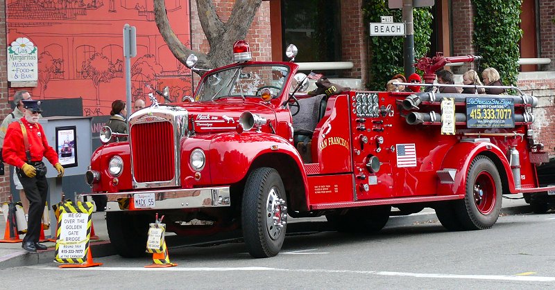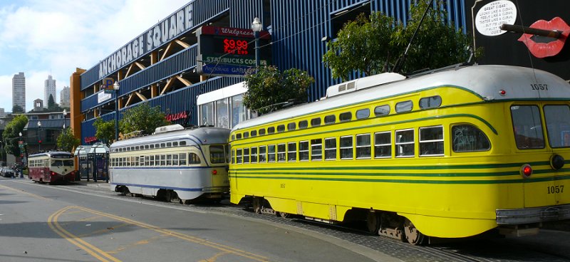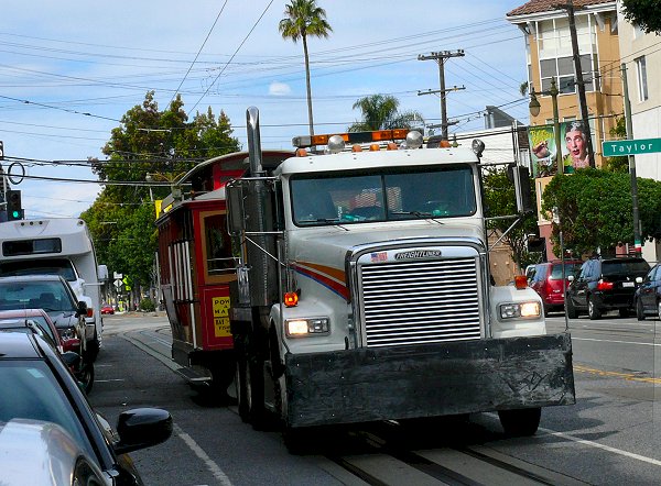 We lopen het steile stuk over het voetgangerspad, dus recht toe recht aan, naar beneden en posten ons op Columbus Street bij de halte van de Cable Car lijn naar het Cable Car Museum. Na een lange tijd wachten komt er een door een vrachtwagen getrokken Cable Car voorbij. De chauffeur roept ons toe dat er een kink in de kabel is gekomen, dat er dus geen Cable Cars meer rijden en dat we beter de bus kunnen nemen. Dat doen we dan maar.