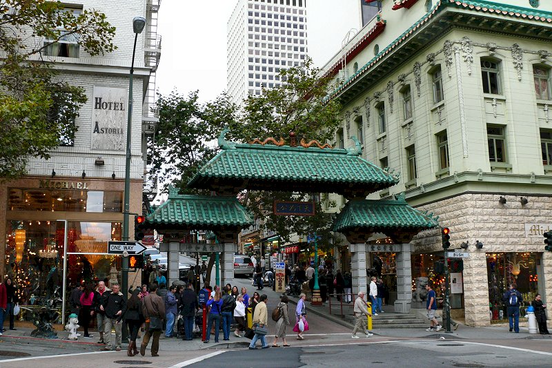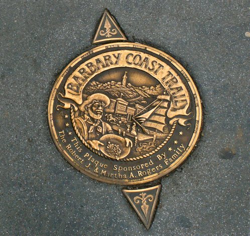 n een Chinatown, waar ook ter wereld, vinden we het altijd gezellig. En het is steeds herkenbaar. Overal worden dezelfde dingen aangeboden en overal vind je huizen die tot tempeltjes zijn omgebouwd. Door deze Chinatown loopt een 6 km lange wandeling: de Barbary Coast Trail. Hij is aangegeven door plaquettes in het trottoir.