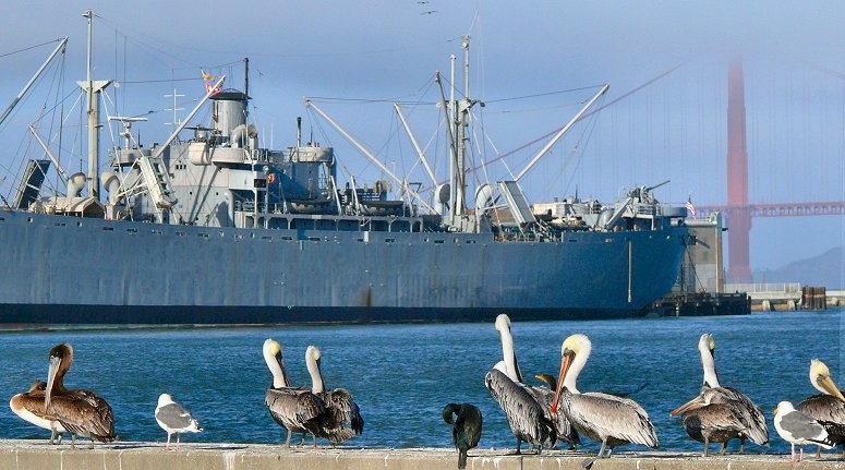 In de haven liggen een oude onderzeeër uit WO II en een Liberty schip. Liberty schepen waren vrachtschepen die tijdens de WO II werden gebouwd in de VS. Ze waren goedkoop en snel te bouwen en werden een symbool van de industriële productie van de VS gedurende de oorlogsjaren.