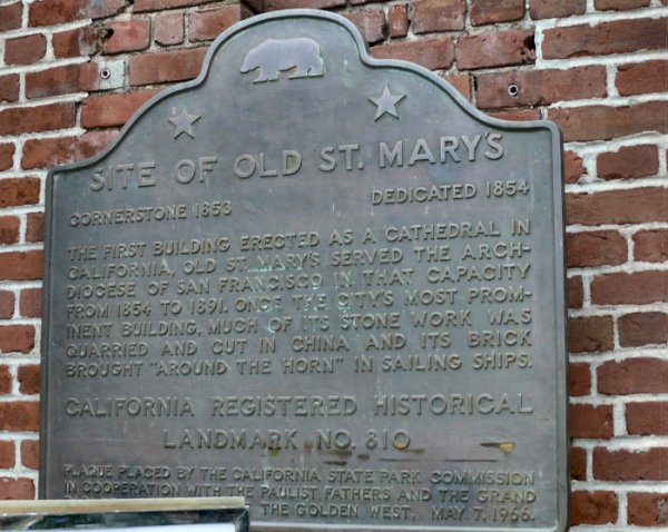 We stappen weer op de Cable Car. We gaan naar het Wells Fargo History Museum. We stappen uit op California Street bij Old Saint Mary's Cathedral. Hij is gebouwd in 1854 als eerste kathedraal in Californië. De fundamenten zijn van graniet, dat uit China werd gehaald. De bakstenen werden als ballast in de schepen vanuit New England rond Kaap Hoorn gevaren. De kerk was toen het hoogste gebouw in Californië. Nu valt hij nauwelijks nog op tussen de wolkenkrabbers van downtown San Francisco. Het is de enige katholieke Chinese parochiekerk in San Francisco. Het was nooit de bedoeling er een Chinese parochiekerk van te maken, maar omdat er zoveel Chinezen in de parochie woonden, is in 1902 op een vergadering van de Paulist Fathers General Chapter het verzoek daartoe gedaan. En dat verzoek is ingewilligd. De kerk werd bij de aardbeving op 18 april 1906 praktisch geheel vernield op de buitenmuren en de toren na. Nauwelijks te geloven is het feit dat de kerk in 1891 werd verplaatst, omdat volgens de toenmalige aartsbisschop Alemany de bordelen van Barbara Coast te dichtbij kwamen. Maar het is toch waar, want het staat in officiële publicaties van de kathedraal.