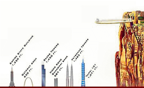 is een glazen brug die 22 m over de rand steekt. De constructie weegt 482 ton en